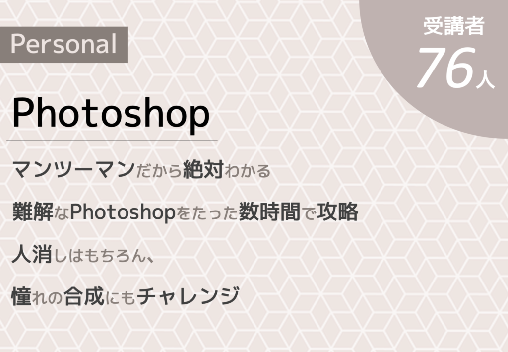 180分のマンツーマンレッスンで難解なPhotoshopを理解し使いこなせるようになります。まったくの初心者でもOKです。